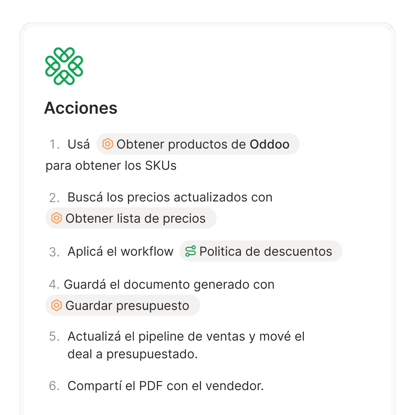 El historial de tus clientes a un mensaje de distancia. Últimas compras, acuerdos y qué recomendar, sin buscar en diez sistemas. Todo en un solo lugar.