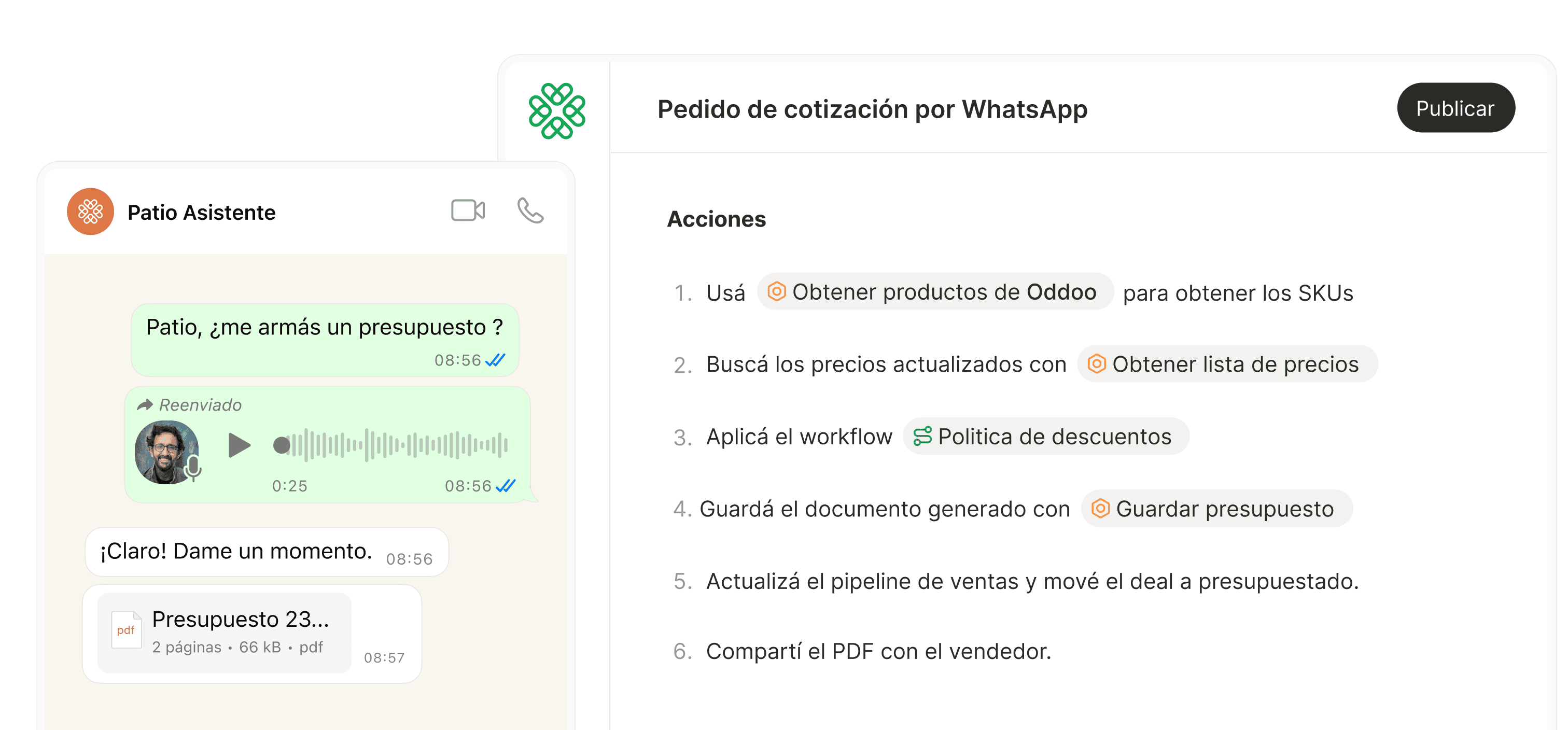 Patio convierte audios, fotos y conversaciones en cotizaciones, seguimientos y métricas. Sin nuevas herramientas, sin cambiar la forma de trabajar.
